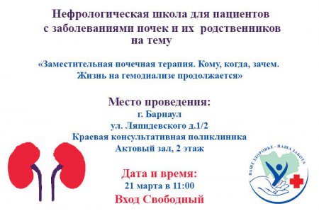 21 марта в 11:00 в актовом зале поликлиники КГБУЗ Краевая клиническая больница состоится очередное занятие нефрологической школы для пациентов с заболеваниями почек и их родственников.
