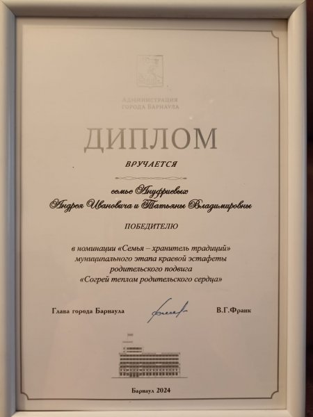 11 октября 31 семья города Барнаула была приглашена на церемонию награждения участников и победителей первого этапа. Семья Ануфриевых не только прошла муниципальный этап, став победителем в номинации «Семья – хранитель традиций», но и прошла на следующий краевой этап.