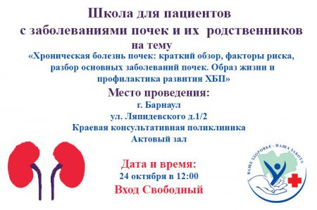 В Краевой клинической больнице продолжает работу школа для пациентов с заболеваниями почек и их родственников. 24 октября в 12:00 состоится очередное занятие на тему «Хроническая болезнь почек: краткий обзор, факторы риска, разбор основных заболеваний почек. Образ жизни и профилактика развития ХБП».