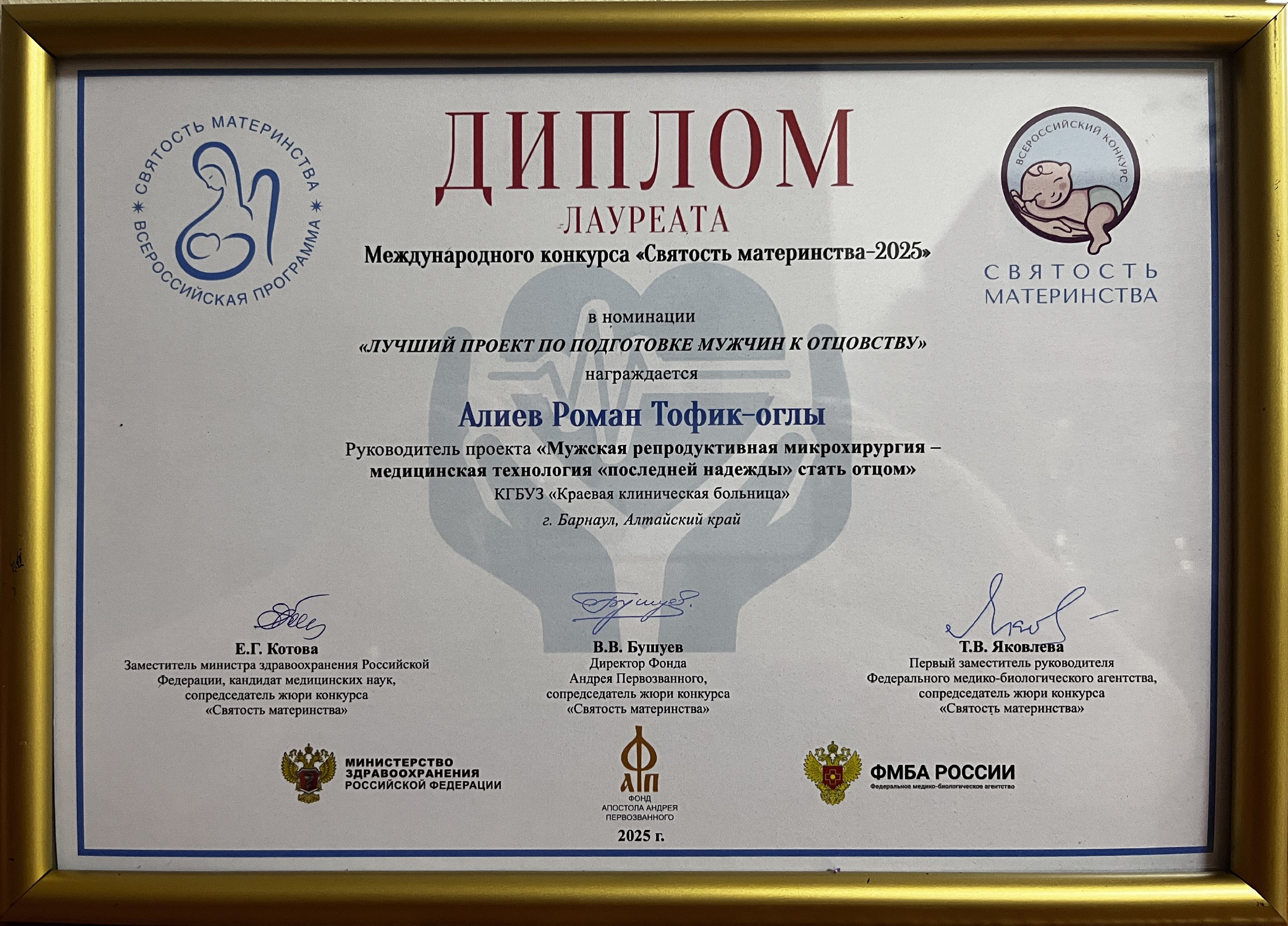 Доктор медицинских наук, руководитель Центра медицинского урологического «Академия мужского здоровья» КГБУЗ Краевая клиническая больница, главный внештатный специалист по репродуктивному здоровью мужчин и президент МОО «Общество специалистов по репродуктивной и сексуальной медицине» Роман Тофикович Алиев получил престижную награду в номинации «Лучший проект по подготовке мужчин к отцовству».