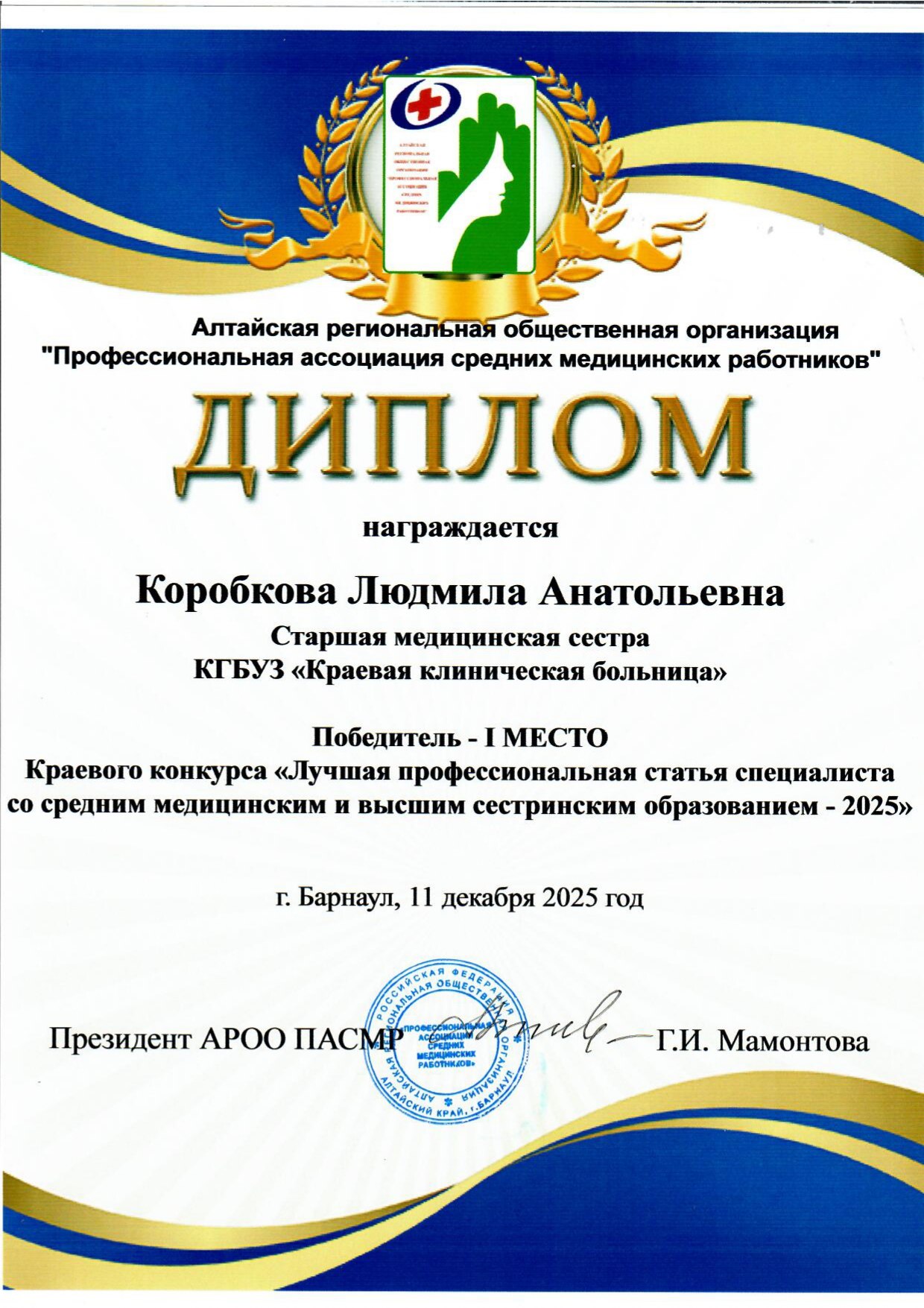В рамках мероприятия прошло торжественное награждение победителей регионального профессионального конкурса АРОО ПАСМР «Лучший наставник - 2025» Первое место заняла Елена Алексеевна Колмакова, старшая медицинская сестра поликлиники. Также были отмечены достижения Людмилы Анатольевны Коробковой, старшей медицинской сестры травматолого-ортопедического отделения, занявшей первое место в конкурсе «Лучшая профессиональная статья специалиста со средним медицинским и высшим сестринским образованием - 2025».