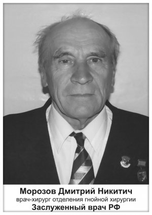 После окончания ординатуры по специальности «хирургия», в 1976 году как высококвалифицированного специалиста, Дмитрия Никитича пригласили в Краевую клиническую больницу на должность врача-хирурга общего хирургического отделения. Позже он был назначен заведующим операционным блоком. А в 1989 году как перспективный работник, способный организатор Д.Н.Морозов назначен на должность заведующего новым структурным подразделением больницы – отделением гнойной хирургии.