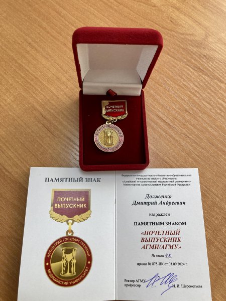 23 сентября в Алтайском государственном медицинском университете прошел Учёный совет, посвященный 70-летию университета. На этом торжественном мероприятии ректор Ирина Шереметьева вручила памятный знак «Почётный выпускник АГМИ/АГМУ» врачу нейрохирургического отделения Краевой клинической больницы, д.м.н., профессору, Заслуженному врачу РФ, главному нейрохирургу Алтайского края Долженко Дмитрию Андреевичу, много лет проработавшему заведующим нейрохирургическим отделением нашей больницы.