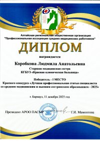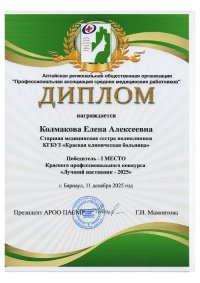 В рамках мероприятия прошло торжественное награждение победителей регионального профессионального конкурса АРОО ПАСМР «Лучший наставник - 2025» Первое место заняла Елена Алексеевна Колмакова, старшая медицинская сестра поликлиники. Также были отмечены достижения Людмилы Анатольевны Коробковой, старшей медицинской сестры травматолого-ортопедического отделения, занявшей первое место в конкурсе «Лучшая профессиональная статья специалиста со средним медицинским и высшим сестринским образованием - 2025».